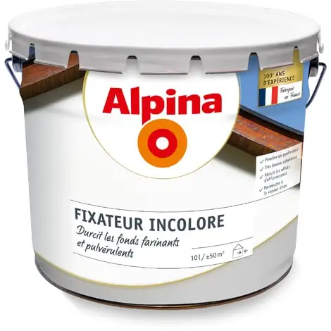 Le fixateur incolore Alpina a été spécialement développé pour la préparation et la rénovation des fonds farinants ou pulvérulents avant la mise en peinture.Caractéristiques :Pénètre en profondeurTrès bonne adhérenceRéduit les effets d’efflorescencePerméable à la vapeur d’eauSupports :Le fixateur incolore Alpina peut s’appliquer sur tous supports de nature minérale à l’image du béton ou du ciment. Il est principalement destiné à une utilisation sur les façades extérieures mais peut également être utilisé en intérieur en fonction de besoins précis.Application :La solution est prête à l’emploi, mélangez avant application et effectuez des passages croisés.Conseils d’utilisation :Il est conseillé d’appliquer le fixateur par temps sec, avec une température comprise entre 5° et 30°C. Pour conserver de manière optimale votre solution, il est important de bien refermer le pot après chaque usage. Le fixateur peut se conserver jusqu’à 12 mois dans son emballage d’origine et avec des conduits correctes (à l’abris du gel et de la chaleur). Le nettoyage des outils s’effectue à l’eau.Contenance : 10LIntérieur – Extérieur : Intérieur et ExtérieurConsommation : 5m²/L