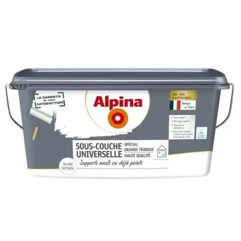 Sous-couche intérieure peinture Alpina pour travaux soignés, acrylique. Prêt à l’emploi et facile d’application.Caractéristiques :Pratiquement sans odeurExcellente adhérenceUniformise l’absorption du supportIdéal pour toutes les pièces de la maisonSupports :Tous supports bruts ou recouverts dune ancienne peinture, tels que plâtre, plaques de plâtre, toile de verre…Séchage : à 20°C et 65% d’humidité relativeSec au toucher : 1 heure – Recouvrable : 6 heuresConsommation :Environ 10m²/L par couche selon l’absorption du support.Contenance : 10LContenance : 5LIntérieur – Extérieur : IntérieurConsommation : 10m²/LRésistance humidité : OUI